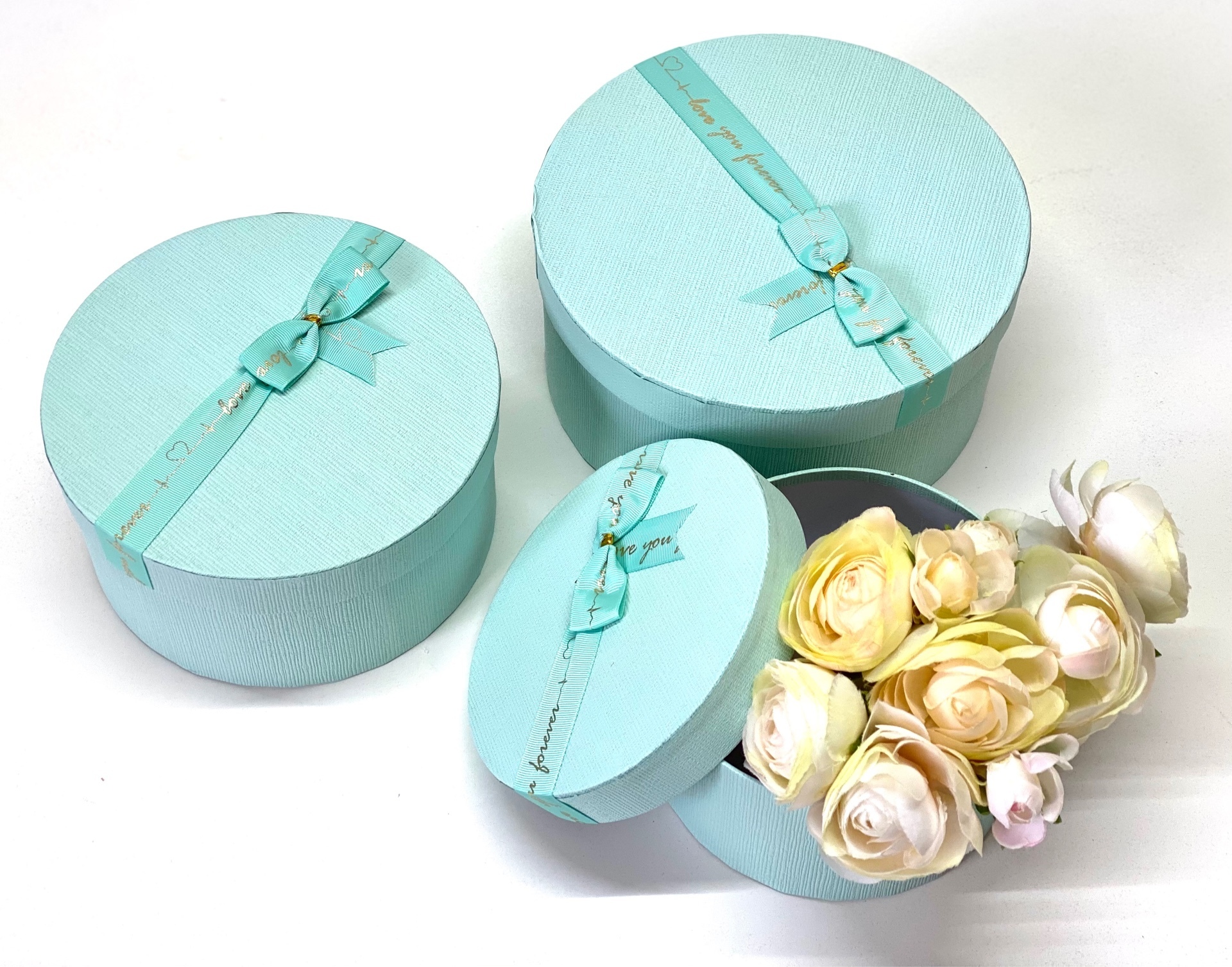 Коробки с бантом FOREVER. В набор входят три круглые коробки Размер: 11 см*23 см; 10,5 см*20 см; 9,5 см*17 см Цвет: Тиффани