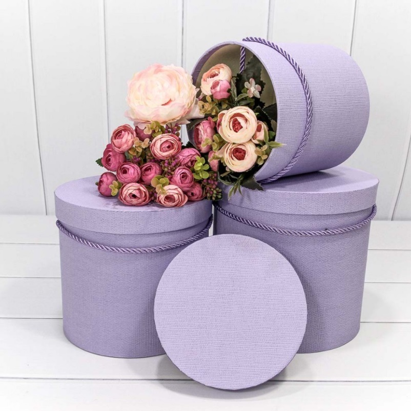 Коробки цилиндр Набор три штуки из дизайнерской бумаги Размер: 19,5*19 см; 17,5*17 см; 15,5*15 см Цвет: Сиреневый