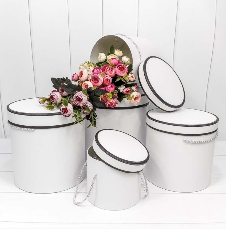 Коробки Цилиндр Набор 5 шт. Размер: 25 см*25 см; 23 см*23 см; 21 см*21 см; 18 см*19 см; 14 см*17 см Цвет: Белый