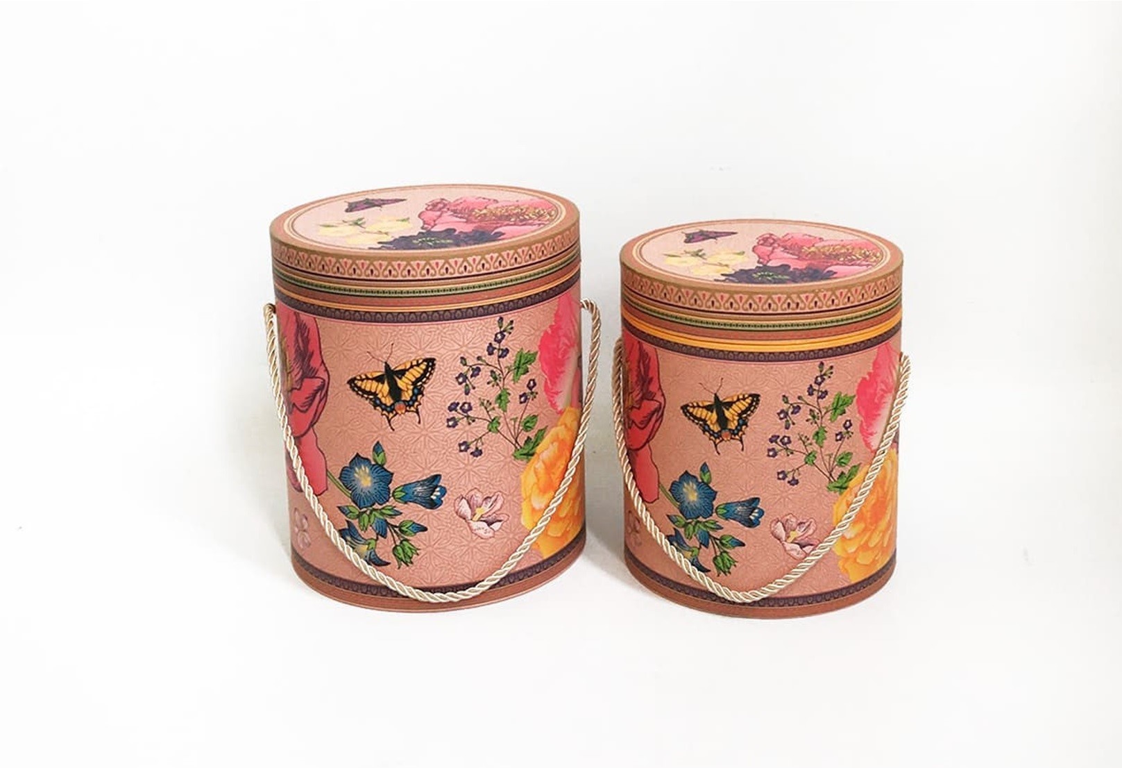 Коробки Цилиндр с ручкой "Бабочки и цветы" Набор 2 шт. Бежевый