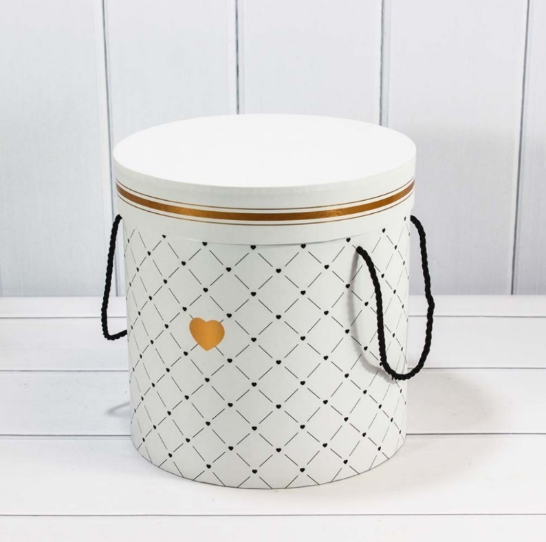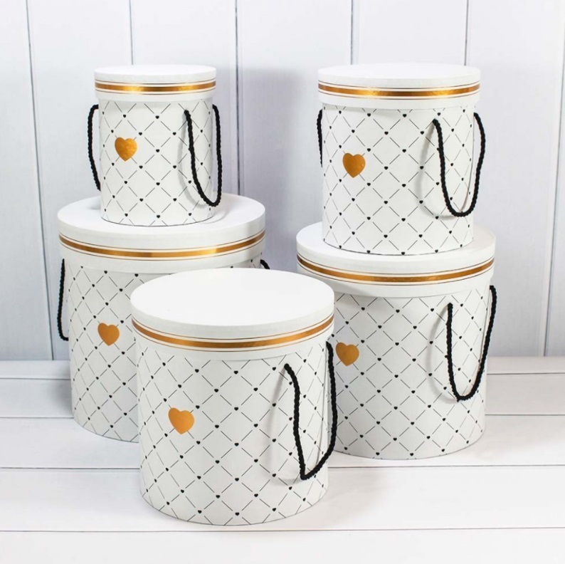 Коробки Цилиндр "Сердечки" Набор 5 шт Размер: 24,5 см*24,5 см*25 см; 23 см*23 см*23 см; 21 см*21 см*21 см; 18 см*18 см*19 см; 14 см*14 см*17 см Цвет: Белая