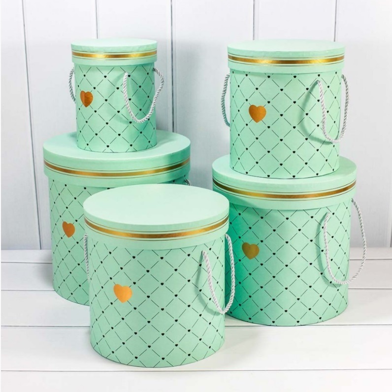 Коробки Цилиндр "Сердечки" Набор 5 шт Размер: 24,5 см*24,5 см*25 см; 23 см*23 см*23 см; 21 см*21 см*21 см; 18 см*18 см*19 см; 14 см*14 см*17 см Цвет: Голубой