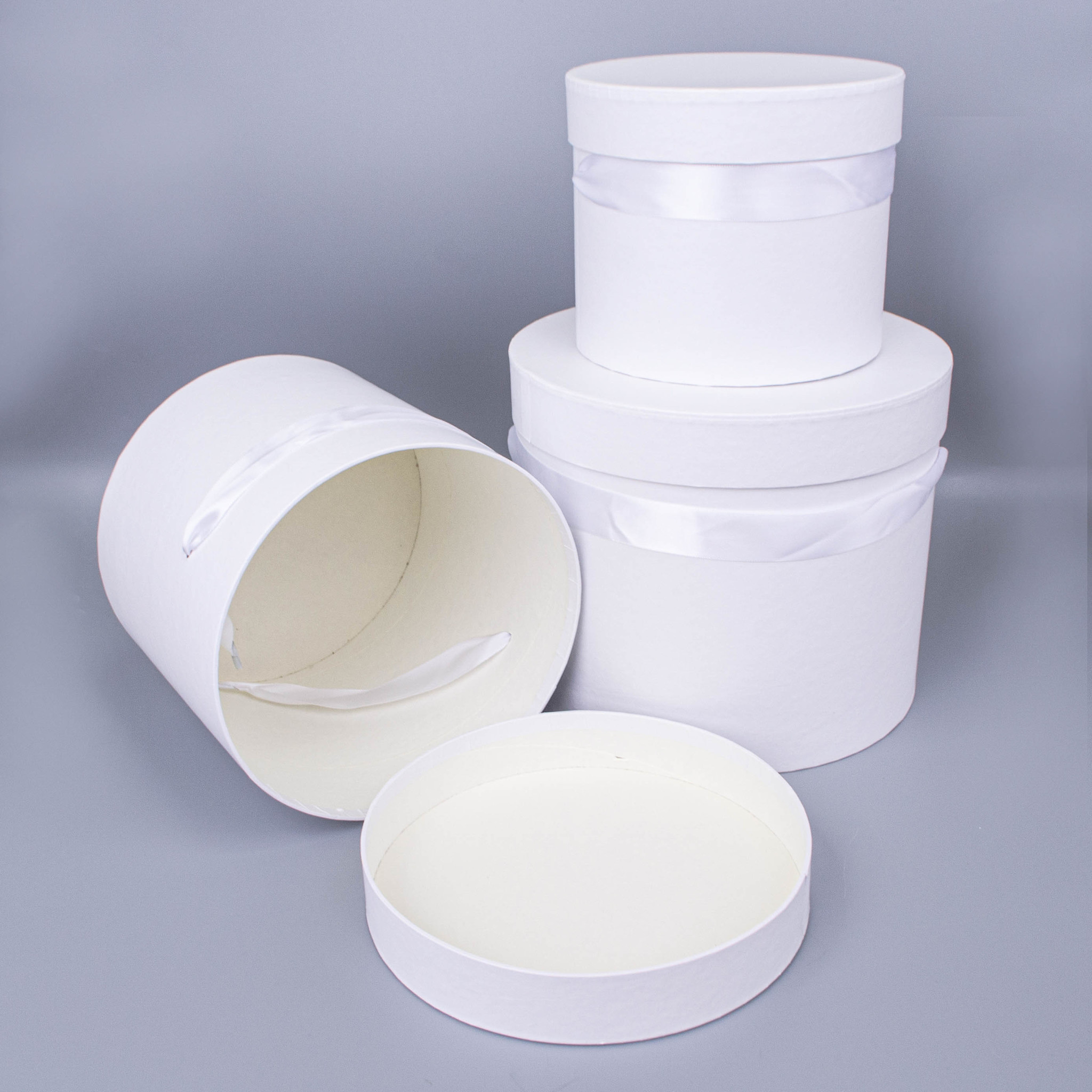 Коробки Тубус однотонный с лентой. Набор 3 шт. Размер: 23 см*19,5 см; 20 см* 17 см; 17 см*14 см. Цвет: Белый