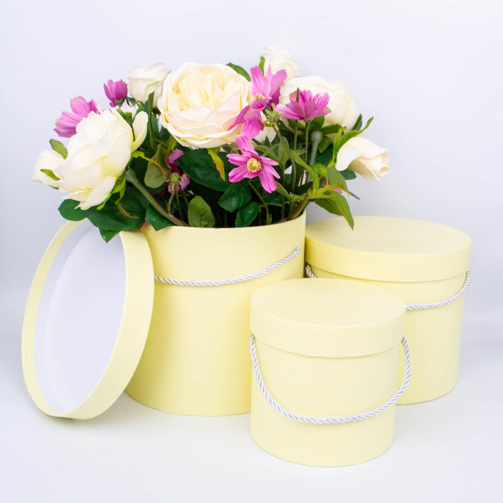 Коробки Тубус однотонный с веревочкой. Набор 3 шт. Размер: 20 см*19 см; 18 см* 16 см; 14 см*17 см. Цвет: Канареечный