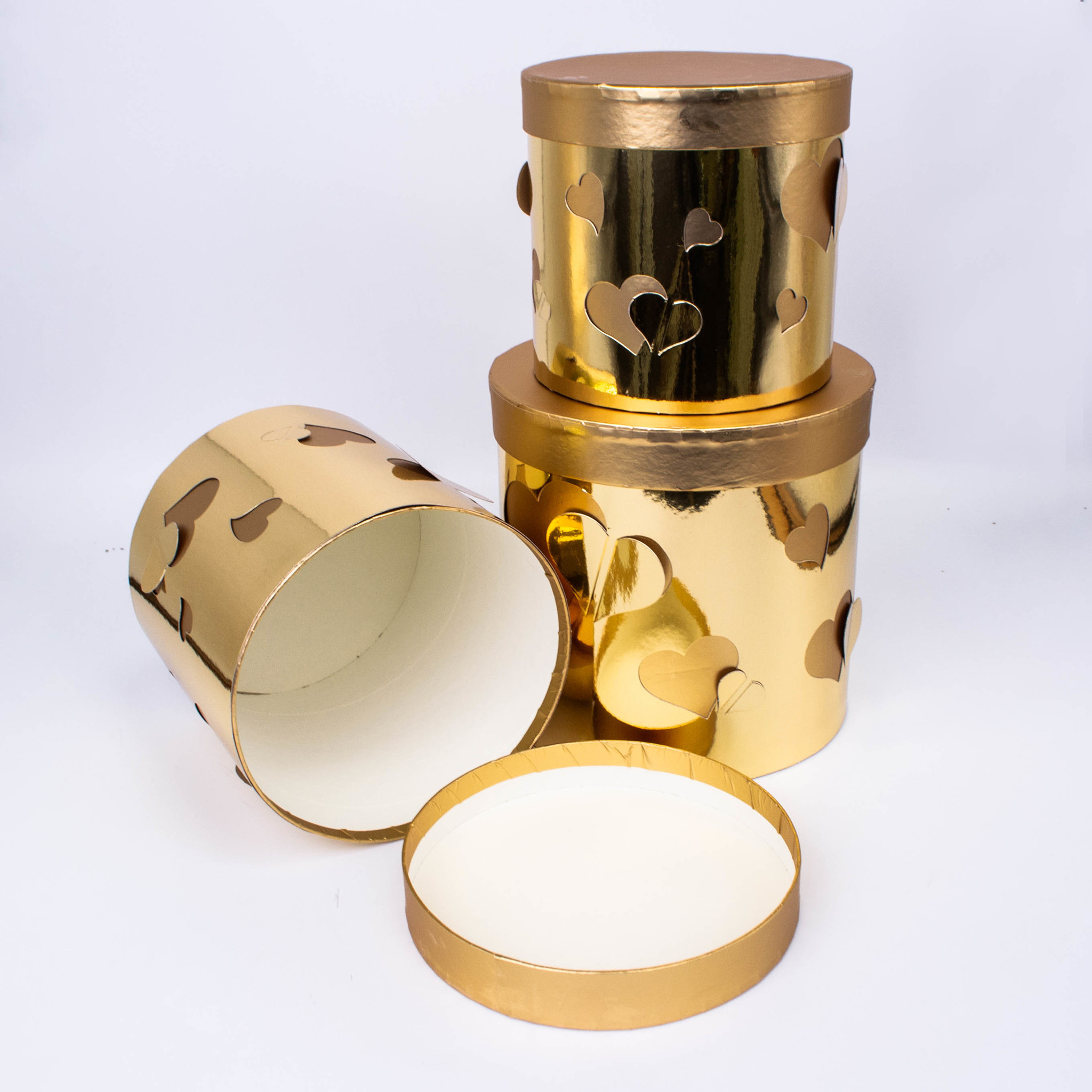Коробки Тубус Сердечки металлик. Набор 3 шт. Размер: 19,5 см*19 см; 17,5 см*17 см;15,5 см*15 см. Цвет: Золото