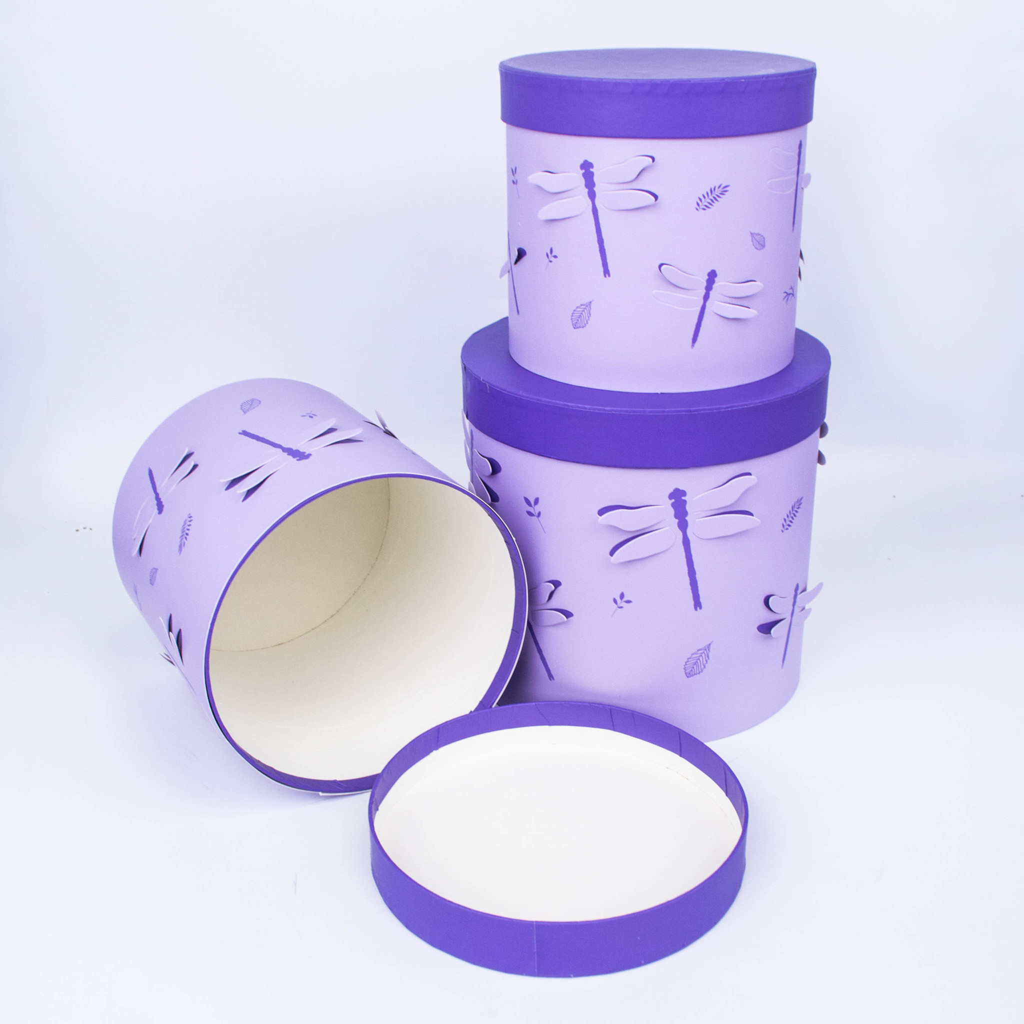 Коробки Тубус Стрекозы. Набор 3 шт. Размер: 19,5 см*19 см; 17,5 см*17 см;15,5 см*15 см. Цвет: Сиреневый