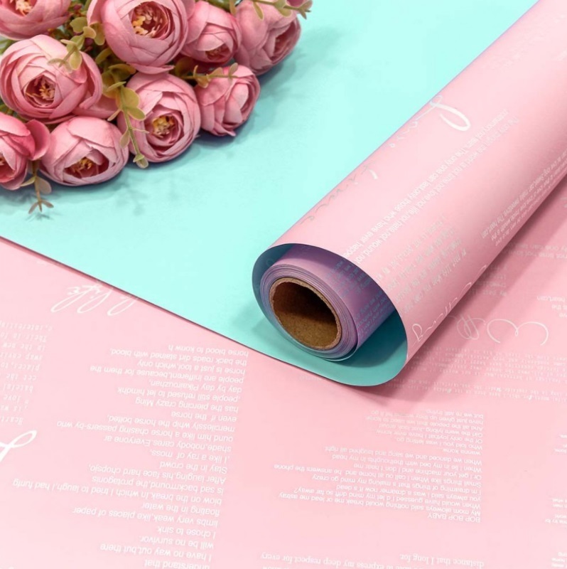 Пленка матовая двухсторонняя с надписями Размер: 0,58*10м Плотность: 65мкм Цвет: Розовый/Голубой