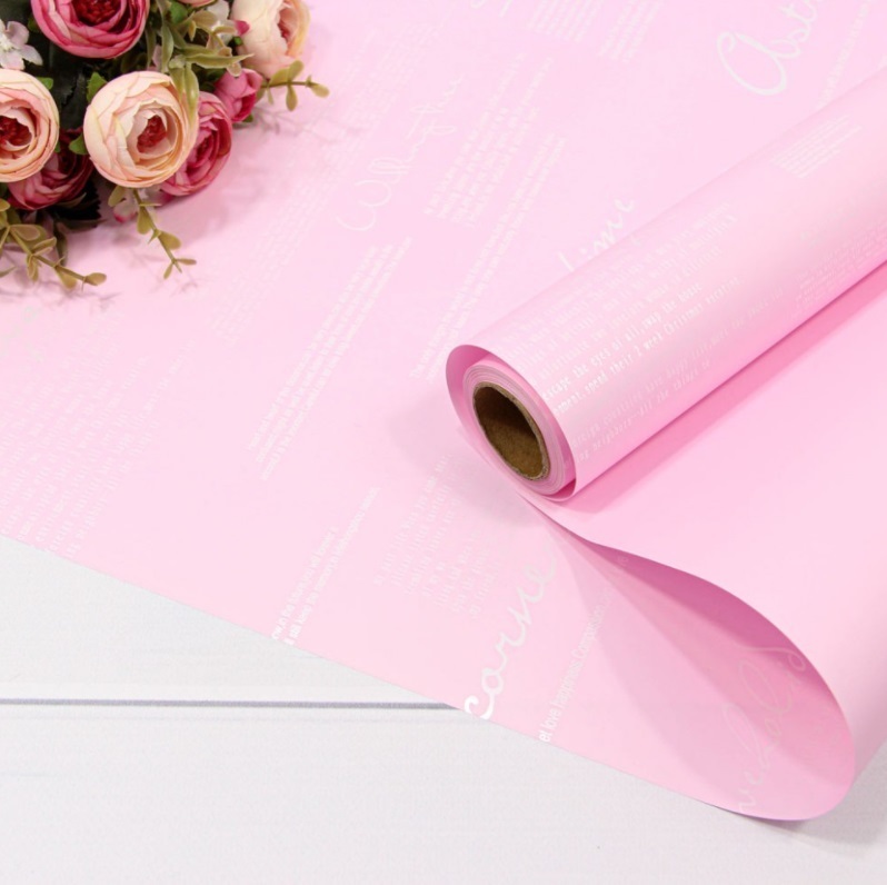 Пленка матовая двухсторонняя с надписями Размер: 0,58*10м Плотность: 65мкм Цвет: Светло-розовый