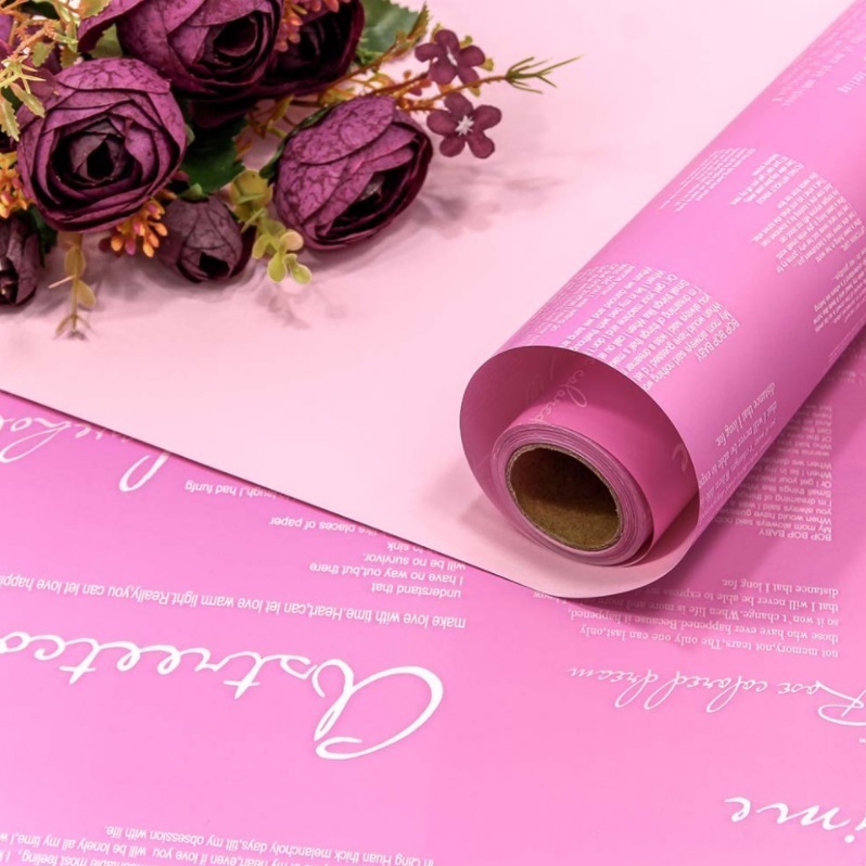 Пленка матовая двухсторонняя с надписями Размер: 0,58*10м Плотность: 65мкм Цвет: Ярко-розовый